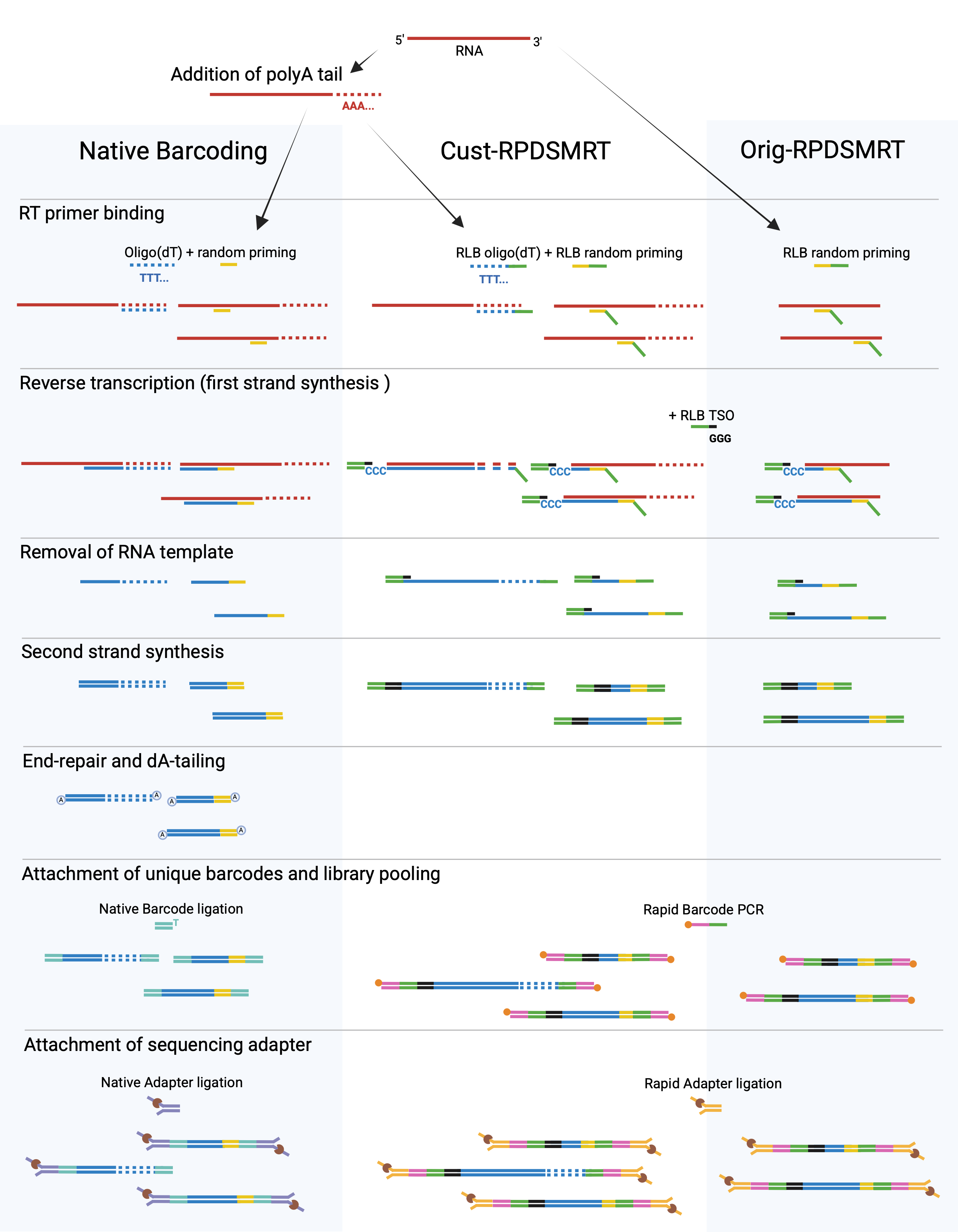 To align with our standard Native Barcoding workflow, we adapted this approach by adding a similarly modified oligo(dT) primer and included a polyadenylation step prior to cDNA synthesis (Cust-RPDSMRT). We also tested ONT’s recommended version, which omits both polyadenylation and oligo(dT) priming (Orig-RPDSMRT). Both protocols use an RLB template-switching oligo (TSO), which binds to Cs added at the 5′ end of the cDNA by reverse transcriptase, enabling the enzyme to extend and incorporate the RLB adapter. This captures full-length cDNA and streamlines downstream amplification. For both Rapid workflows, we used the NEB LunaScript® RT Master Mix Kit (Primer-free).