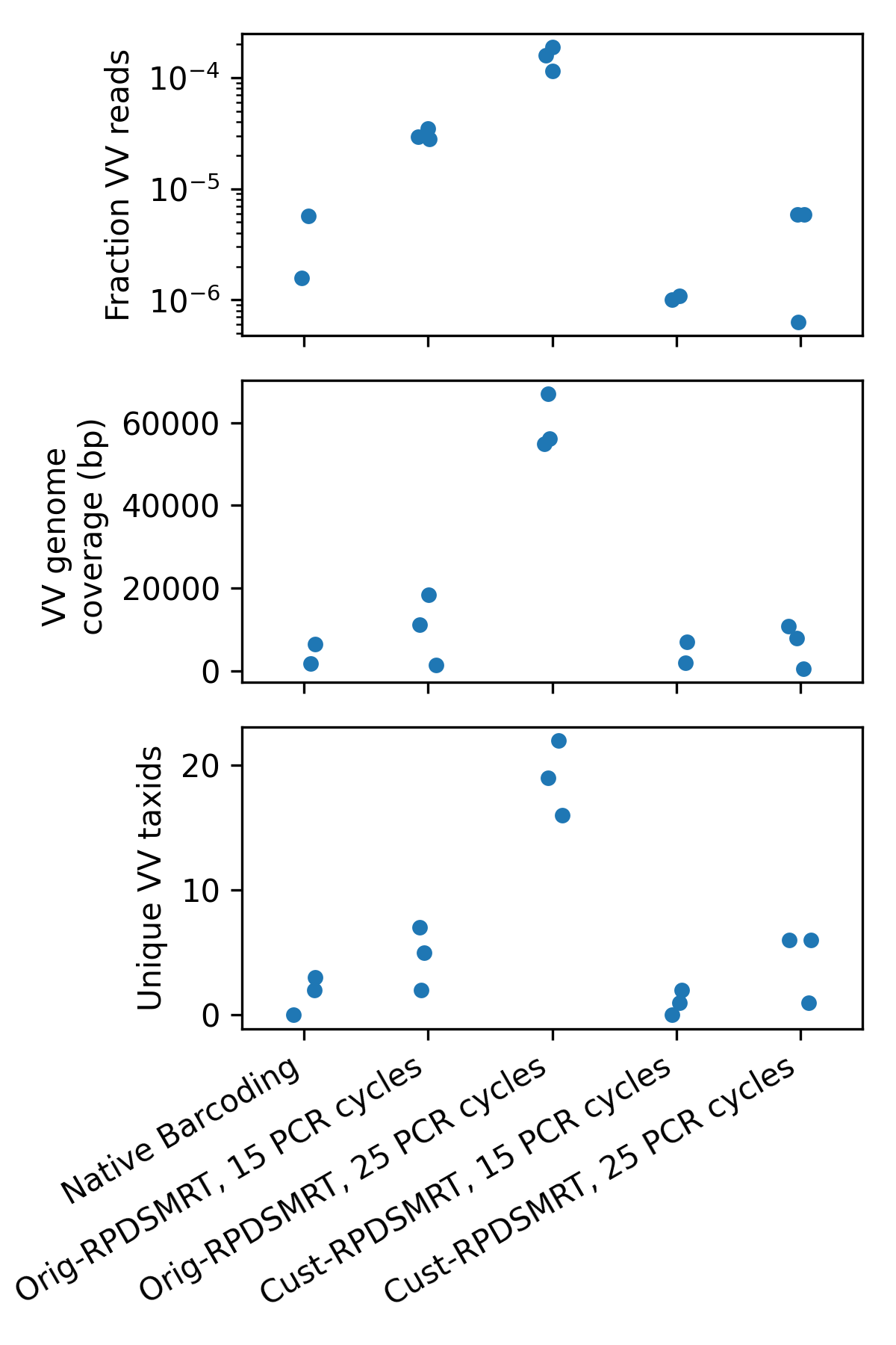 We examined each protocol to check which gave the highest vertebrate-infecting virus (VV) content (Figure 2). We first looked at the VV read fraction (top panel); Orig-RPDSMRT with 25 PCR cycles had by far the highest read fraction of all the protocols. We next checked two measures of unique viral material: genome coverage (total viral base pairs, middle panel), and number of unique viruses found (bottom panel). These measures should not be affected by duplication rate. Orig-RPDSMRT with 25 PCR cycles looked better by all measures than both Native Barcoding and Cust-RPDSMRT.