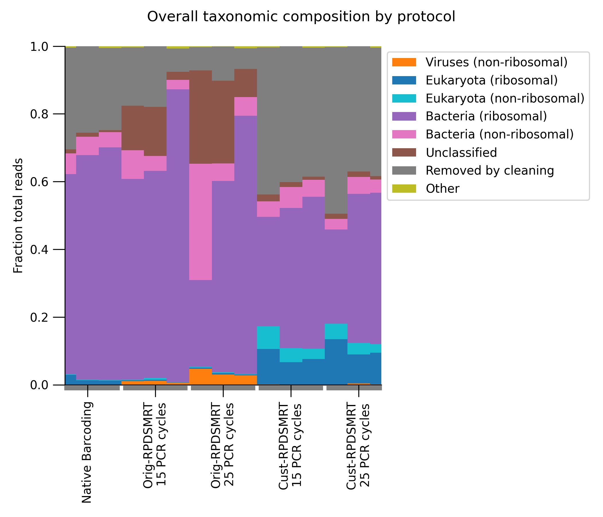 By contrast, Cust-RPDSMRT looks potentially problematic–it has the highest fraction of “reads removed by cleaning” and of eukaryotic reads. To follow up, we looked specifically at the fraction of reads mapping to the human genome (Figure 4); we want this to be as low as possible. As we can see, this is much higher with the Cust-RPDSMRT protocol than with either of the other protocols.