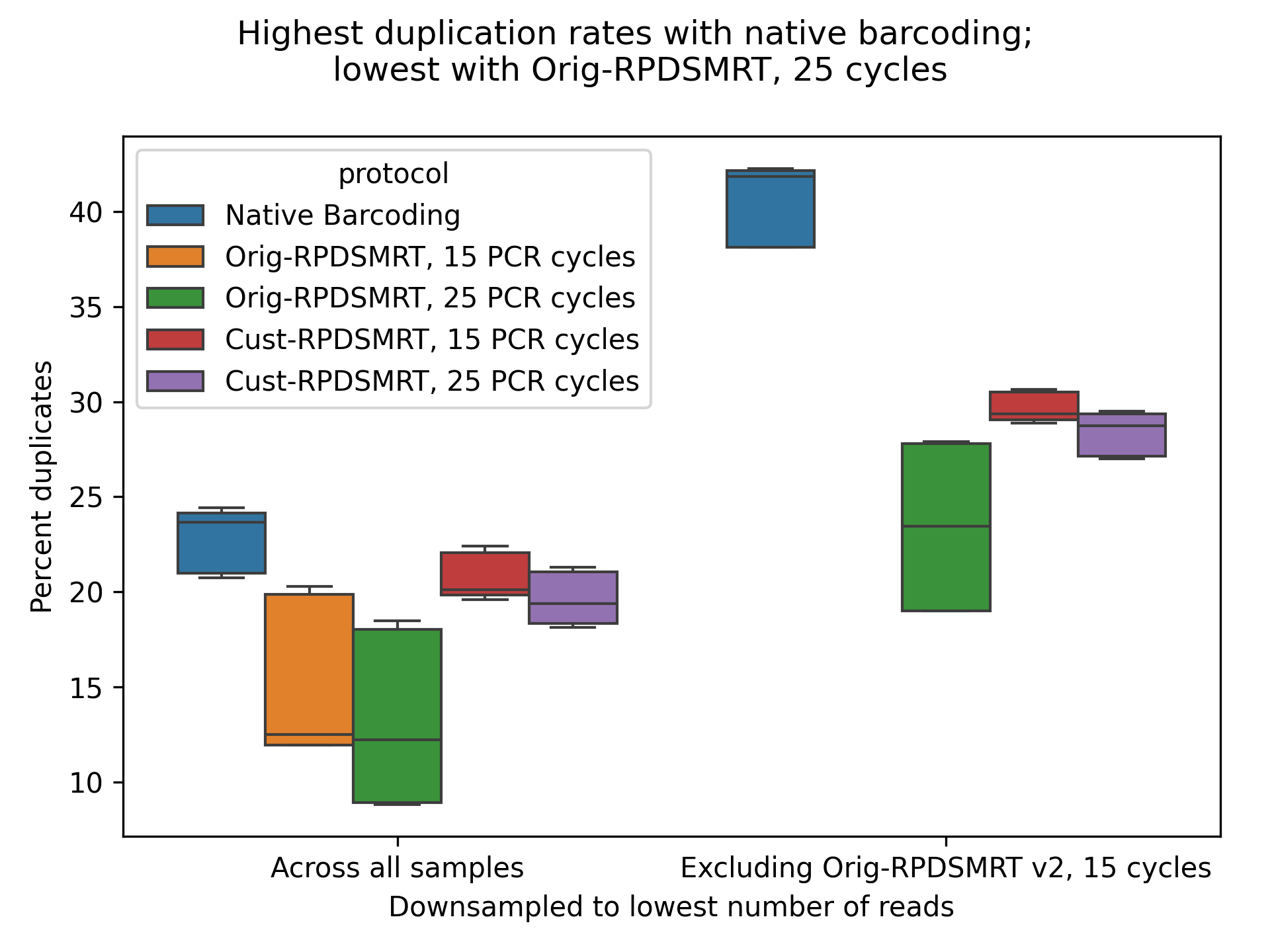 Finally, we look at duplication rates, as measured by FASTQC (Figure 7). We downsampled each sample to ~65,000 reads, the lowest number of reads observed in any sample, to avoid confounding by differing read counts. We also tried excluding Orig-RPDSMRT with 15 PCR cycles (which had anomalously low read counts, Fig. 1) and downsampling to ~500,000 reads. We can see that Orig-RPDSMRT has the lowest duplication rate; 15 and 25 PCR cycles give similar duplication rates.