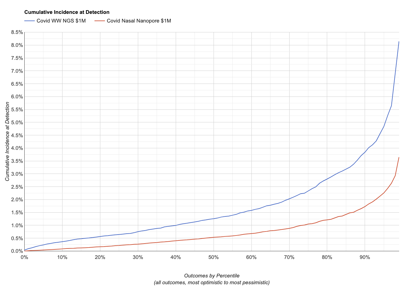 The simulation is only as good as its inputs, and some of the inputs are pretty rough, but here’s an example. Let’s say we’re willing to spend ~$1M/y on a detection system looking for blatantly genetically engineered variants of any known human-infecting RNA virus. We’re considering two approaches: