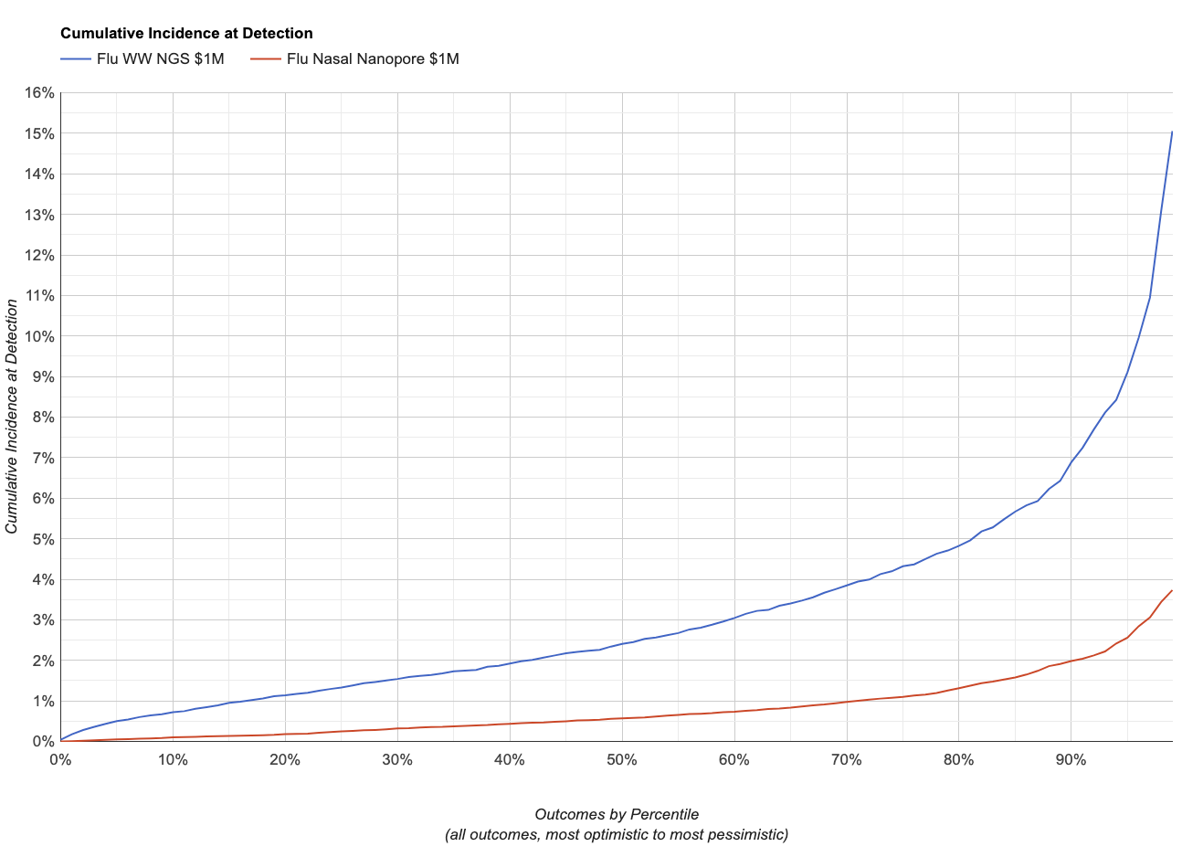 A higher cumulative incidence at detection means more people have been infected, so on this chart lower is better. Given the inputs we used, the simulator projects Nanopore sequencing on nasal swabs would have about twice the sensitivity as Illumina sequecing on wastewater. It also projects that the difference is larger at the low percentiles: when sequencing swabs there’s a chance someone you swab early on has it, while with wastewater’s far larger per-sample population early cases will likely be lost through dilution. You can explore this scenario and see the specific parameter settings here.