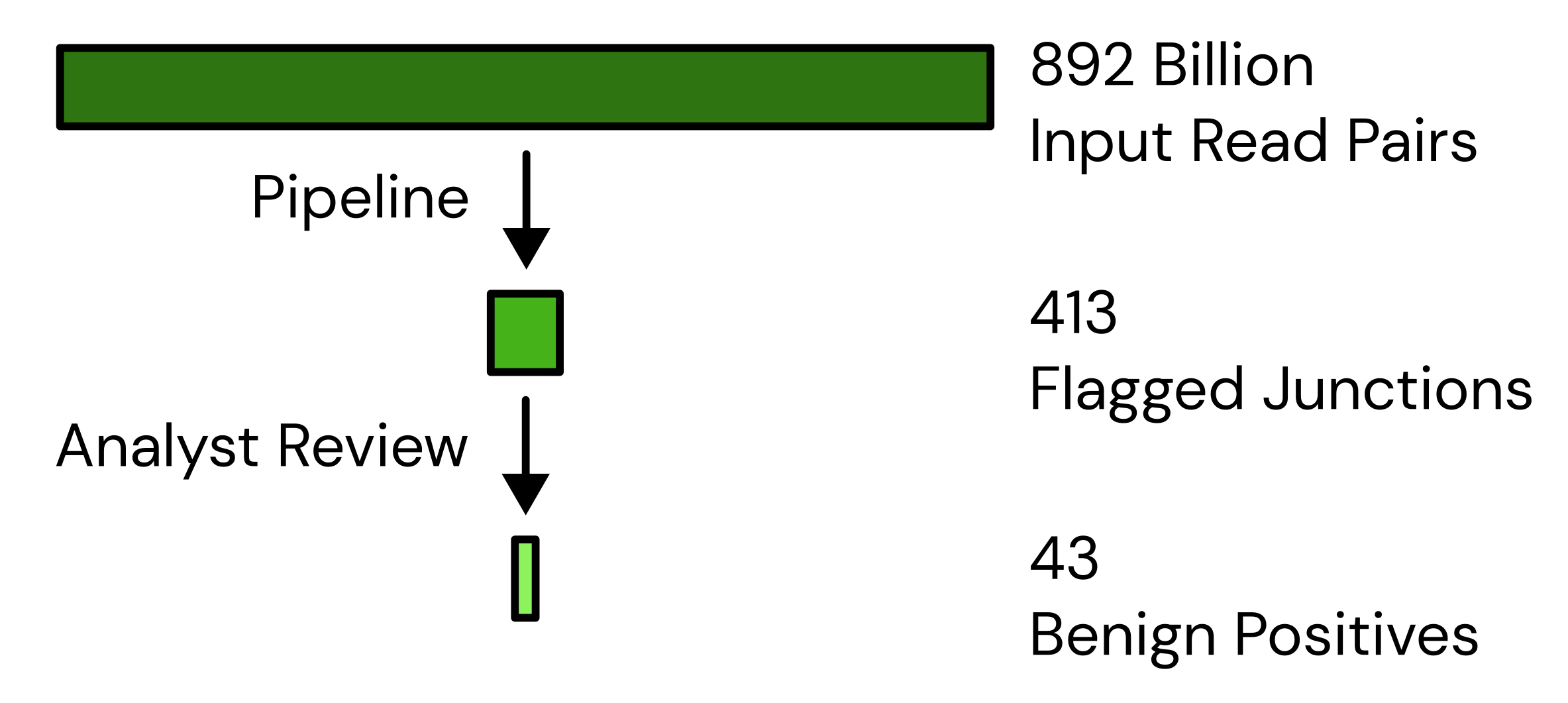 Our chimera-based genetic engineering detection system has now processed a total of 892B read pairs, of which it has flagged 413 collections of overlapping reads for human review. Most of these 413 are a range of false positives that our system is not yet sufficiently sophisticated to exclude automatically. Of these, however, 43 are what we call “benign positives”: reads from genomes that the system is correct to flag, even though they don’t represent a hazard to humans. Most of these 43 are lab contamination, primarily lentiviral and adenoviral vectors, used in other work at the Johnson Lab. We’ve also improved the flagging algorithms, increasing sensitivity while also increasing specificity, and also improved the tooling that supports the manual analysis, surfacing more relevant information to the analyst to speed up their judgements. In Q3 we plan to extend this system to automatically assemble these reads outwards, further increasing the information available to analysts.